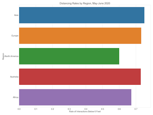 That shared space includes office space. Many of the Fortune 1000 companies we work with in Asia either mandate or readily provide masks and face shields for all employees. Furthermore, in some Asian countries, mask use in the workplace is even mandated by the government on a national level. Therefore, it might not be as surprising to see employees are much more comfortable coming into proximity to their masked co-workers. We saw this also play out when we examined the rate of interactions below 1.8 meters (6 feet).