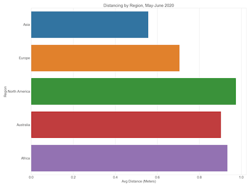 To do so, we analyzed sensor data from 20M+ SQFT of office space across the five continents that VergeSense has sensors installed within (Asia, Europe, North America, Australia, and Africa). Specifically, we took a look at both the average distance in meters of employees and the rate of interactions below 1.8 meters (6 feet) for May-June.