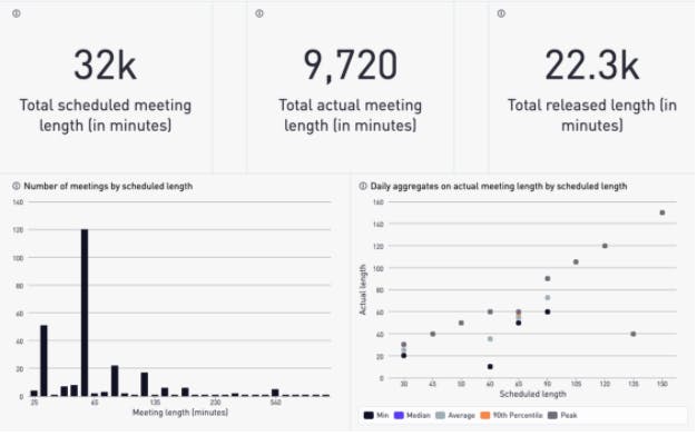 Understanding the average length or duration of meetings will also provide additional transparency around the habits behind the organizers. Depending on the average time spent across meetings, certain scheduled conferences may be able to be cut short, releasing the space for additional users. For example, if a meeting is scheduled for 1 hour, and released within 45 minutes, opportunity exists for another group to have a quick meeting prior to the next scheduled.