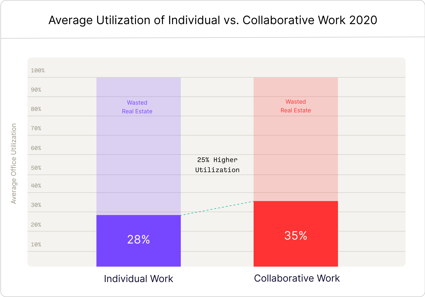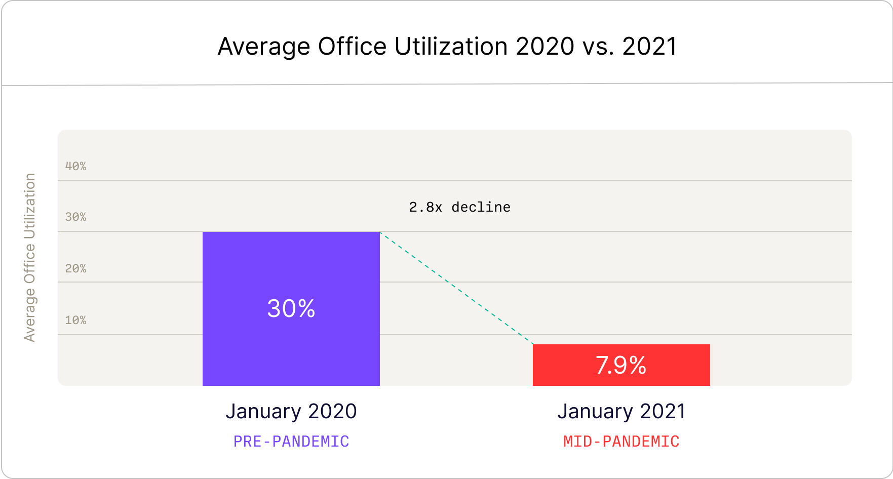 Preliminarily, we found that on average, offices were only 30% utilized pre-pandemic. Ultimately, the pandemic didn’t cause office under-utilization — it put a spotlight on it. We believe that companies should no longer strive to “return to normal.” Instead, enterprises should strive to reinvent their office spaces to maximize office utilization while enhancing the company’s global real estate portfolio.