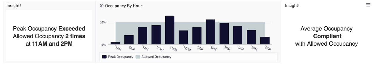 Our COVID-19 Wellness Compliance Dashboard includes visualizations of when and where peak occupancy is exceeded throughout the day. Workplace teams can strategize on how to smooth out the peaks by staggering working hours or redistributing shift assignments.
